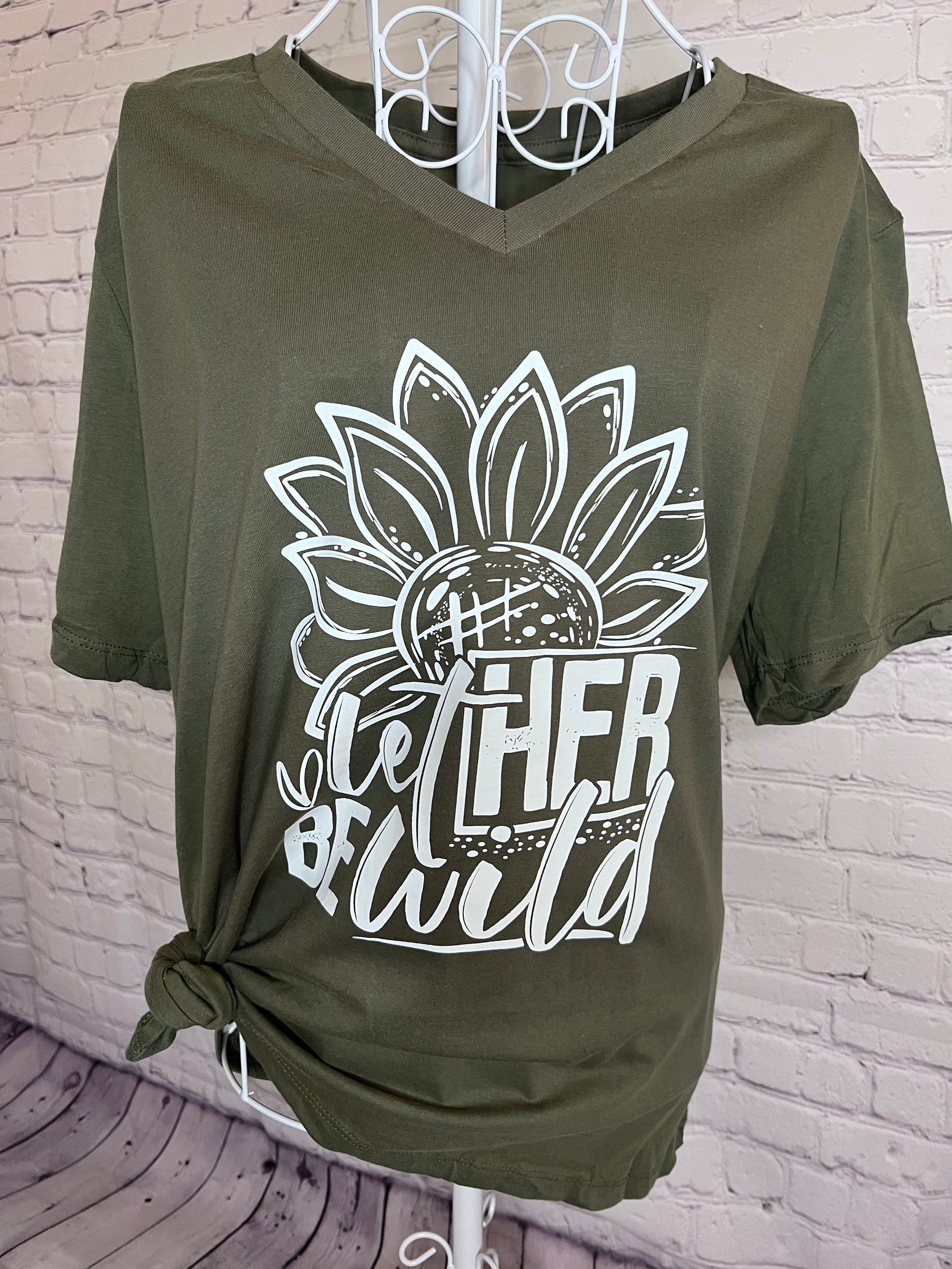 Enjoy the softness and comfort of this let HER BE wild screen print v-neck t-shirt. Show your wild side without saying a word! Featuring a classic v-neck silhouette, this shirt allows you to "let her be wild" in style. Let the good vibes flow while expressing your unique spirit! 🤩