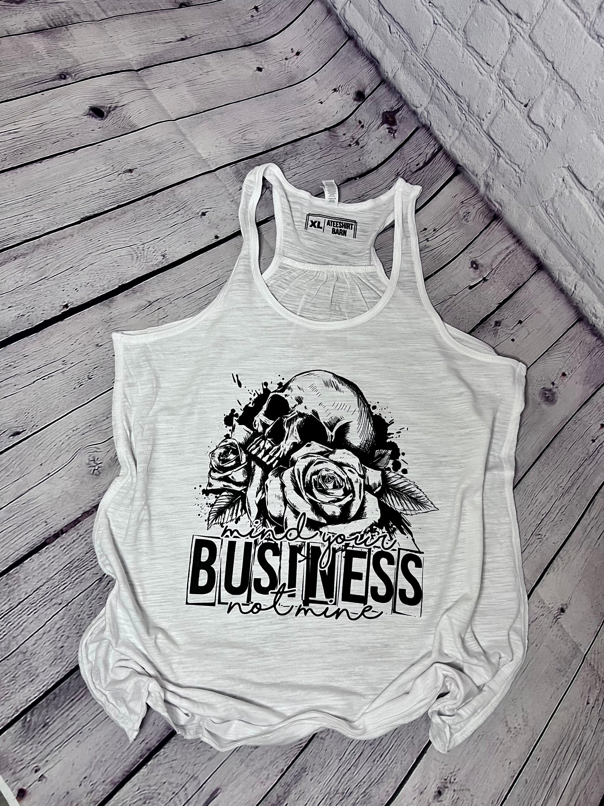 Let your wardrobe remind the world to keep their nose out of your business with this πMind your own business not mine racerback tank top featuring a black screen print of roses and a skull. With a rebellious message & bold style, this tank is sure to turn heads. So don your mindset and stay focused on you!