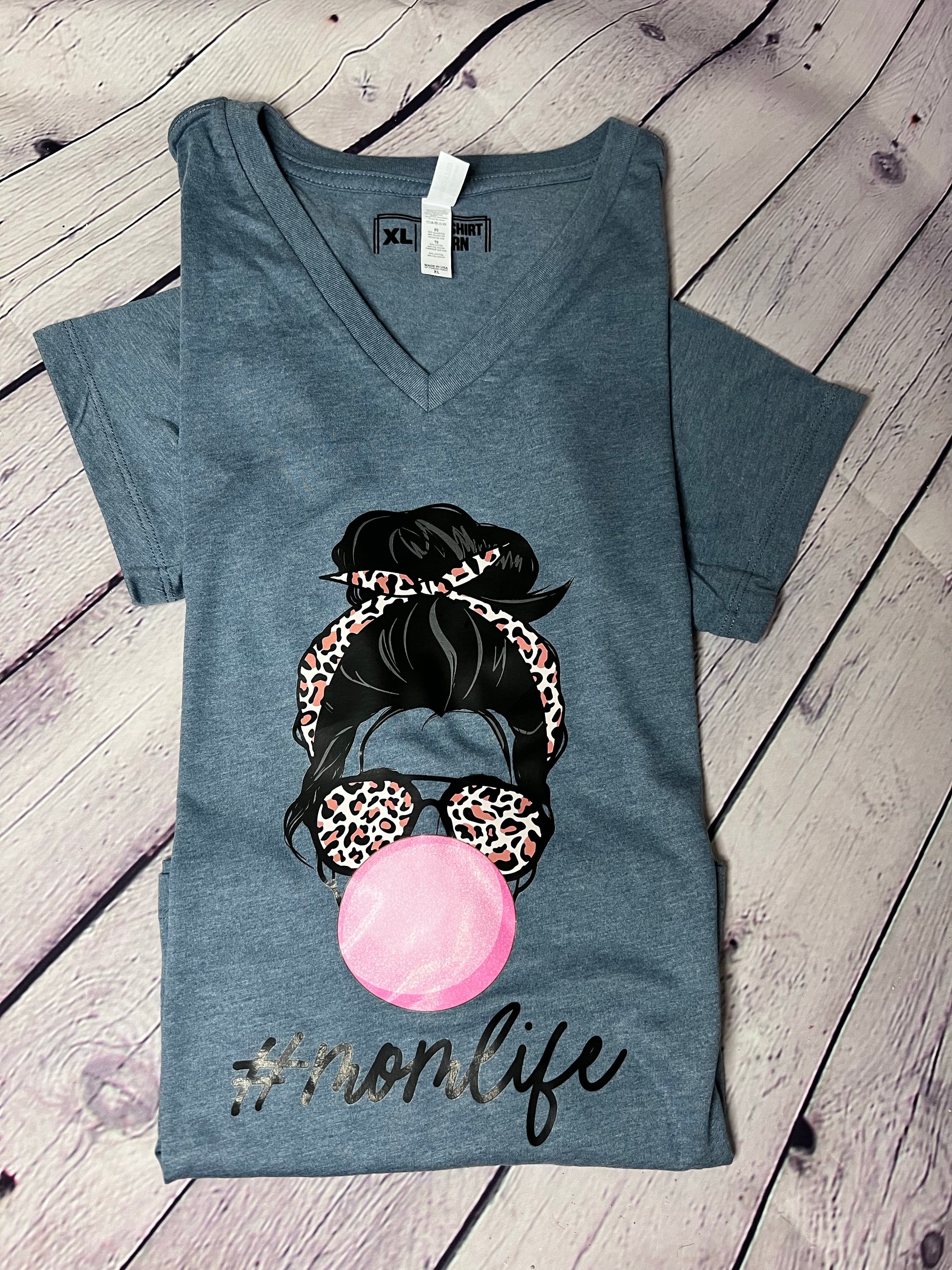 life bubblegum screen print on a slate blue Bella + Canvas v-neck T-shirt