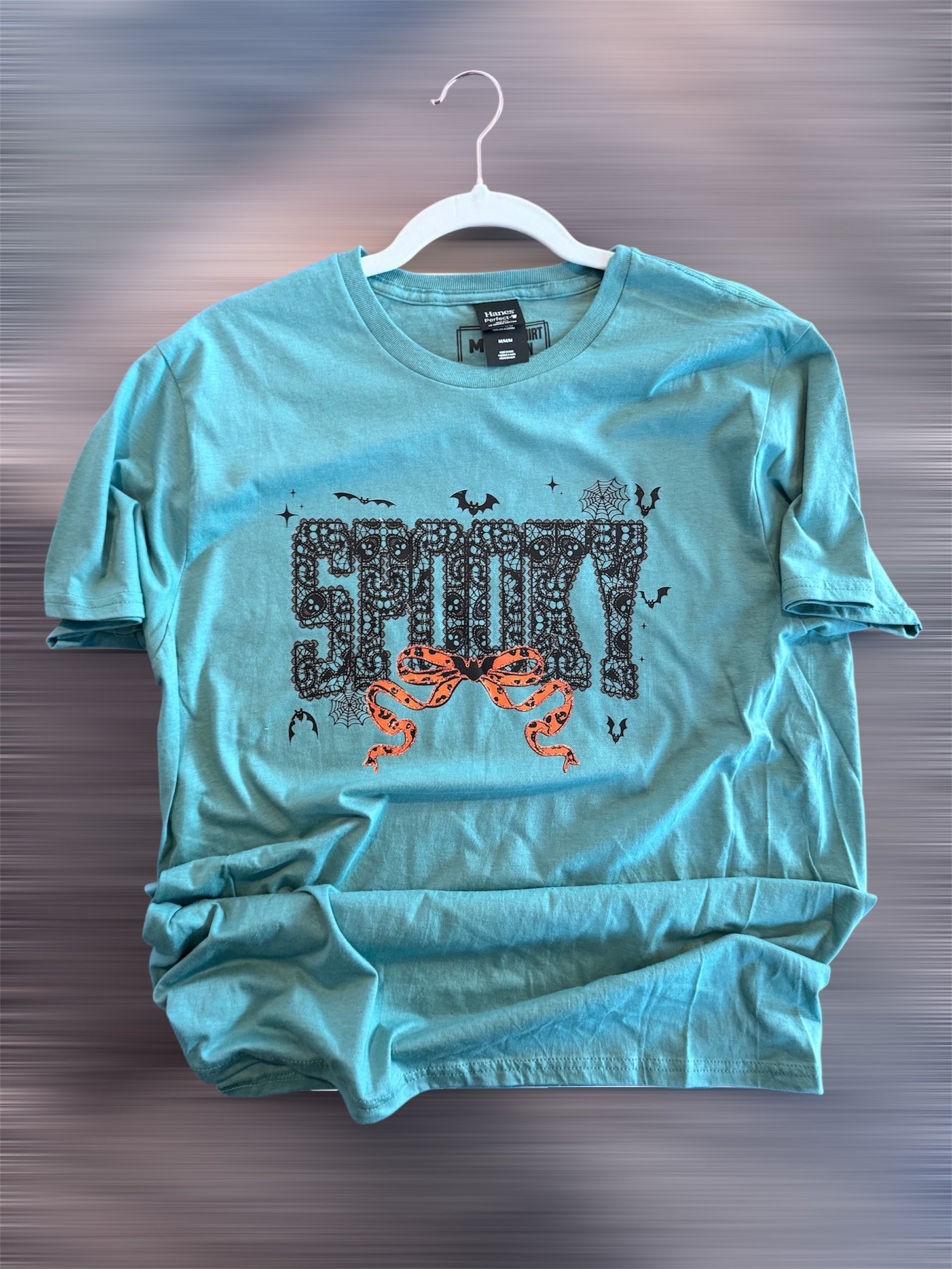 Unleash your inner spooky spirit with our Spooky laced tshirt. Made with a unique lace design, this shirt will add a touch of quirkiness to any outfit. Perfect for Halloween or any time you want to add a little creepiness to your style. No tricks, just treats with this shirt!