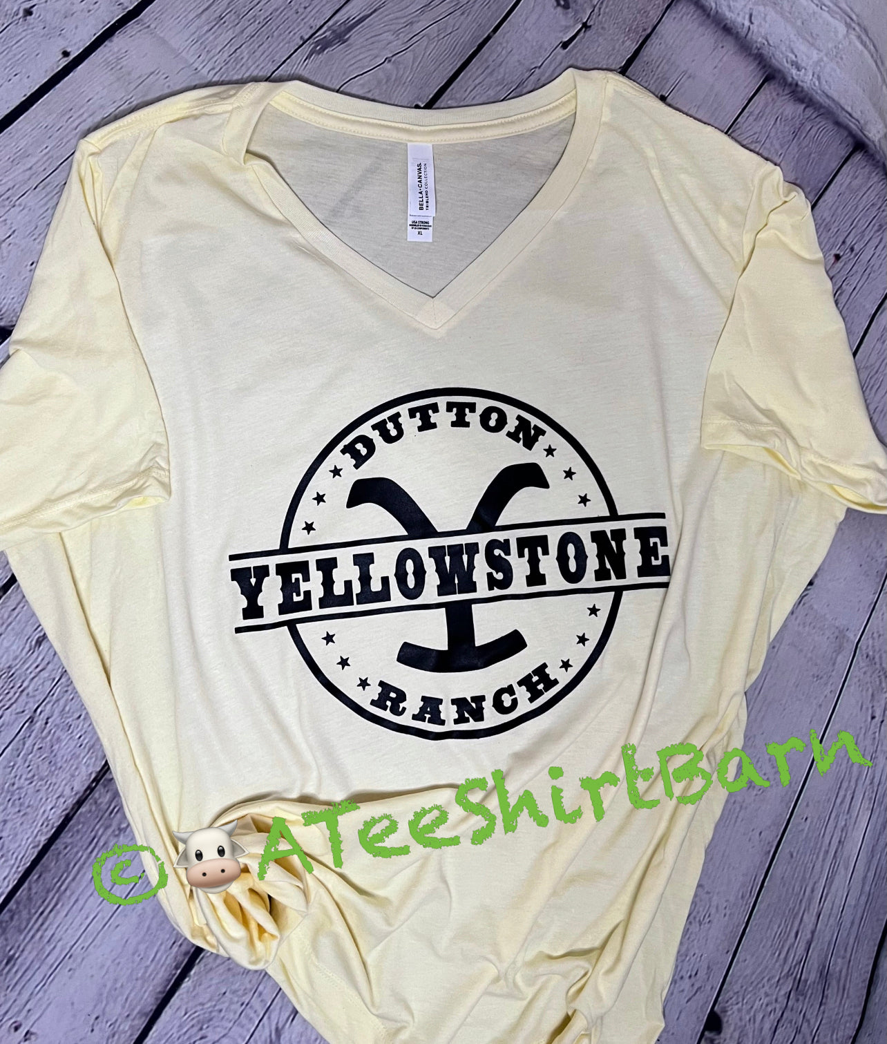 This Yellowstone Dutton Ranch-adorned pale yellow v-neck will have you calling yourself Ranch King (or Queen)! Treat yourself to a really wild night out and flaunt this fashionable homage to the ranch and its namesake! Our comfy cotton fabric will make sure you look hot while feeling cool. Yahtzee!